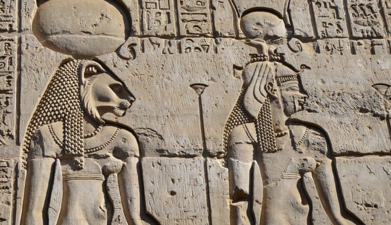 Die ägyptische Göttin Sachmet ist eine Löwengöttin. Sie wurde neben der Darstellung als Löwe, menschlich abgebildet, mit dem Kopf eines Löwen. Auf ihrem Kopf befand sich meistens die Sonnenscheibe mit der Uräus-Schlange.